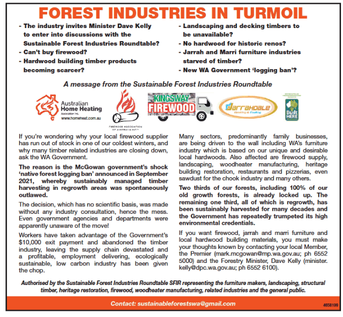 SFIR has repeatedly and unsuccessfully urged the State govt to reserve for WA home consumers and the firewood and furniture industries, the huge amounts of jarrah clear-felled for mining.
